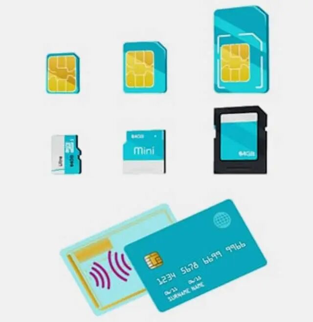 SIM 卡(用户身份模块):SIM 卡存储用户凭证和移动网络数据,支持语音通话、短信和移动互联网等功能。每个 SIM 卡都包含一个 IMSI(国际移动用户识别码),用于与蜂窝网络进行身份验证。SIM 卡已从过时的全尺寸格式(信用卡大小)缩小至 mini-SIM (25 x 15 mm)、micro-SIM (15 x 12 mm) 和nano-SIM (12.3 × 8.8 mm)。在移动设备中,nano-SIM 卡因其空间利用率高而占据主流地位。值得注意的是,mini-SIM 卡现已普遍被称为 SIM 卡或标准 SIM 卡。