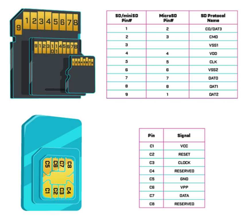 SD 卡和 SIM 卡均通过卡面上的导电垫(即引脚或触头)与主设备建立通信连接。这些引脚与连接器插座中的对应触头对齐,可完成电路连接。每个引脚在标准布局(称为引脚排列)中均分配以特定功能。