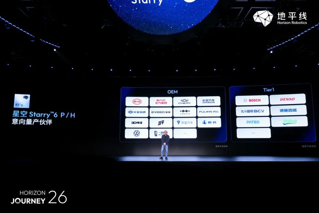 发布会当天,地平线官宣星空芯片获得十余家车企品牌及数家Tier 1合作意向,包括北汽集团、比亚迪集团、长安集团(长安启源、深蓝)、大众集团、奇瑞集团(风云、iCAR、捷途、星途)、一汽奔腾等车企;北斗智联、博世、博泰车联、德赛西威、电装、法雷奥等国内外Tier 1。“星空6”将助力合作伙伴实现单车1500-4000元的硬件成本优化,并作为高效的底层技术架构,为车企预留广阔创新空间,让“千人千面”的智能体验拥有真正的硬件土壤。
