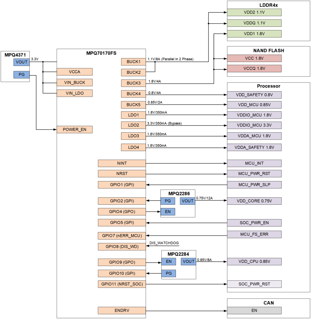 图3中,单颗MPQ70170FS即可覆盖Processor、NAND FLASH、LPDDR4x三大模块共11路电源需求;