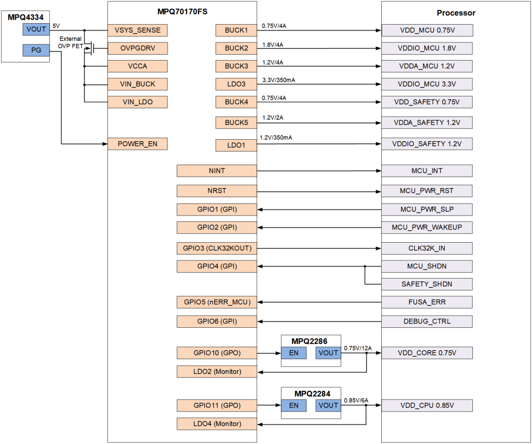 依托灵活可编程的上下电时序控制,MPQ70170FS可完美适配各类SoC与外设的差异化时序要求;其GPIO引脚支持多场景复用,既可将GPIO引脚配置为EN/PG信号,与MPQ2284/2286等外部分立大电流Buck芯片协同,为SoC核心提供高功率供电,也可将GPIO引脚灵活配置为RST、SLP、WAKEUP、ERROR、CLK等功能信号,全面覆盖不同应用场景的定制化需求,真正实现“一芯多用、全场景适配”。