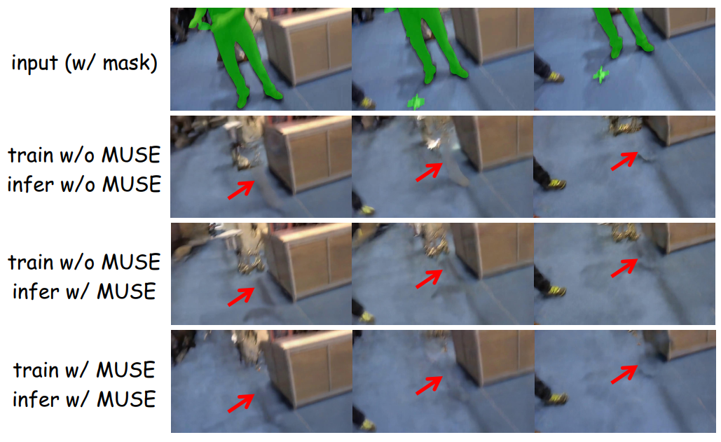 使用 MUSE 训练和推理,可以明显改善快速运动突变帧消除失效的问题