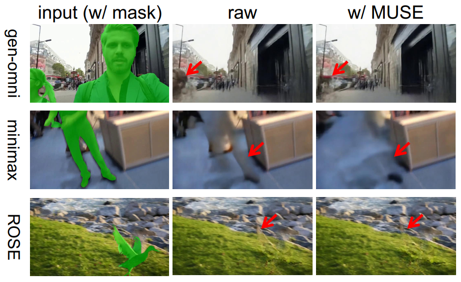 就像你拍视频的时候,即使物体在动,你也能凭肉眼追踪它的轨迹。MUSE 也是这个思路——通过时间窗口内的遮罩联合,确保快速运动的物体能被完整消除,不再出现"闪一闪又出现"的尴尬。