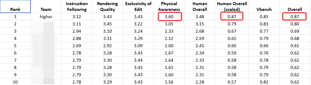 基于SVOR 的方案在 CVPR 2026 物理感知视频实例消除挑战赛(https://xiangbogaobarry.github.io/PVIX-CVPR-VGBE-2026/)中,从18支参赛队伍中脱颖而出,荣获**第一名**(见结果榜单https://docs.google.com/spreadsheets/d/18qfBQesVNpHadUP\_cdL6T8hPGH\_cXrnJ94Z5H-zuibs,Team name: higher),在物理感知、人工评分和总分上大幅领先其他参赛队伍。