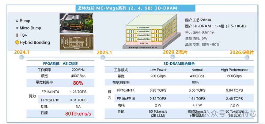 基于3D分布式TPU架构的LPU技术路线,迈特芯产品落地的核心亮点在于高性能与高能效的双重领先。其LPU芯片技术路线采用全国产工艺及传统制程加3D DRAM堆叠,功耗平均5W,带宽高达600GBps,带宽利用率达到80%,大模型推理速度高达80tps,这种技术创新的核心价值,体现在三个层面。