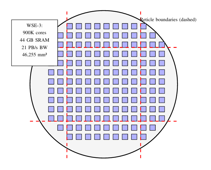 Cerebras WSE3的晶圆级架构示意图:整个晶圆就是一个芯片,网状互联跨越所有光罩边界