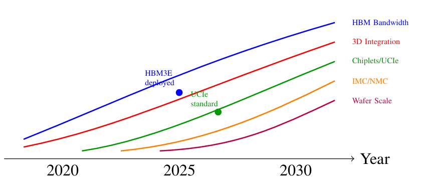 3. 集成策略:计算和内存的物理集成方式,比如单芯片、2.5D中介层、3D堆叠、晶圆级集成