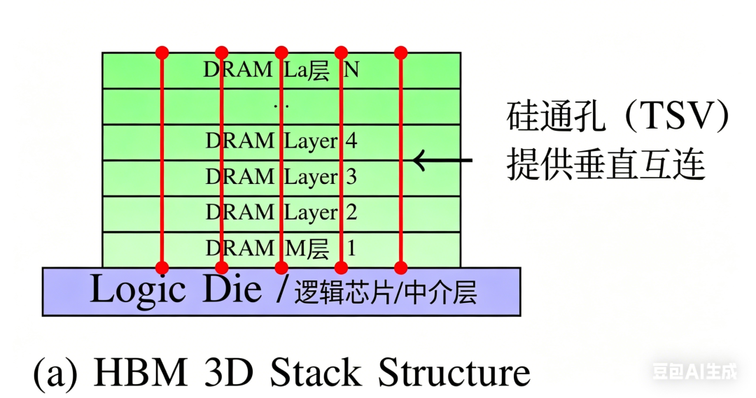 HBM本质就是把内存颗粒竖着叠起来,用硅通孔(TSV)技术把每一层连起来,再和计算芯片做在一起。