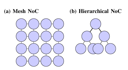 AI加速器常用的两种NoC拓扑:左为2D网状,右为分层拓扑