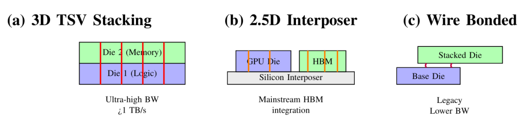 第一种是3D TSV堆叠:芯片直接叠在一起,用TSV做垂直连接,带宽最高,但散热和良率问题最难解决。