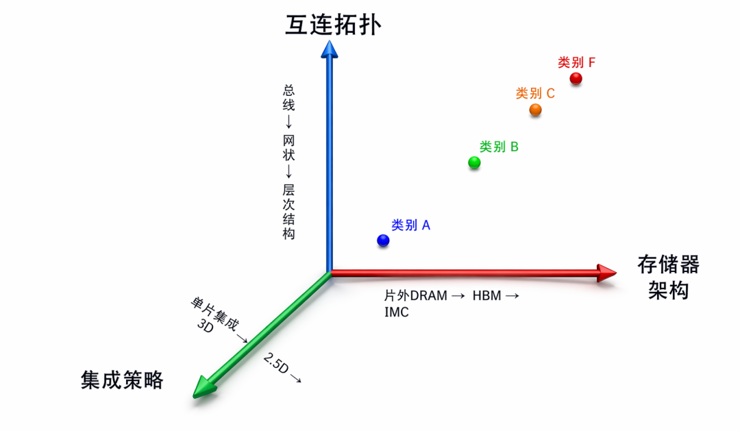 但现在内存和互联已经决定了AI加速器的性能。于是一个全新的三维分类框架,三个坐标轴分别是: