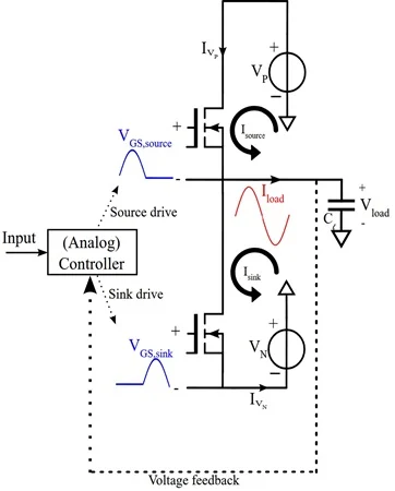 图 2 电压反馈放大器中适配容性压电负载的推挽式 AB 类输出级