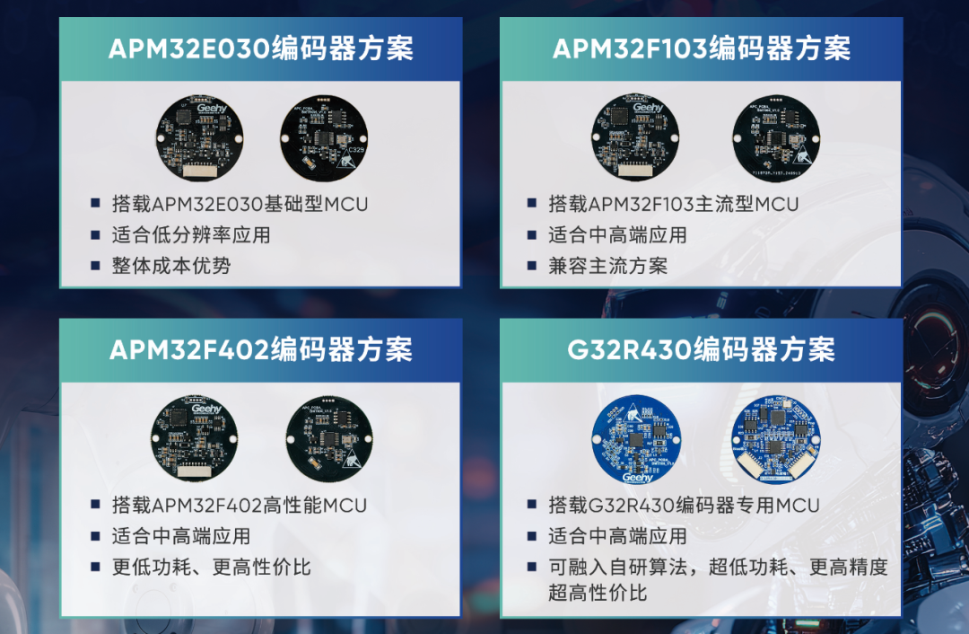 ◾极海编码器综合方案:具备低延迟、高精度、高速率、灵活可定制等优势;四款方案均采用小型化设计,电路板直径小至35mm,适用于40mm法兰的伺服电机;覆盖12~16位分辨率的绝对值编码器类型,可满足低中高端不同需求场景。