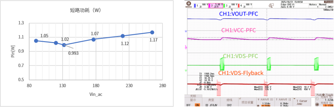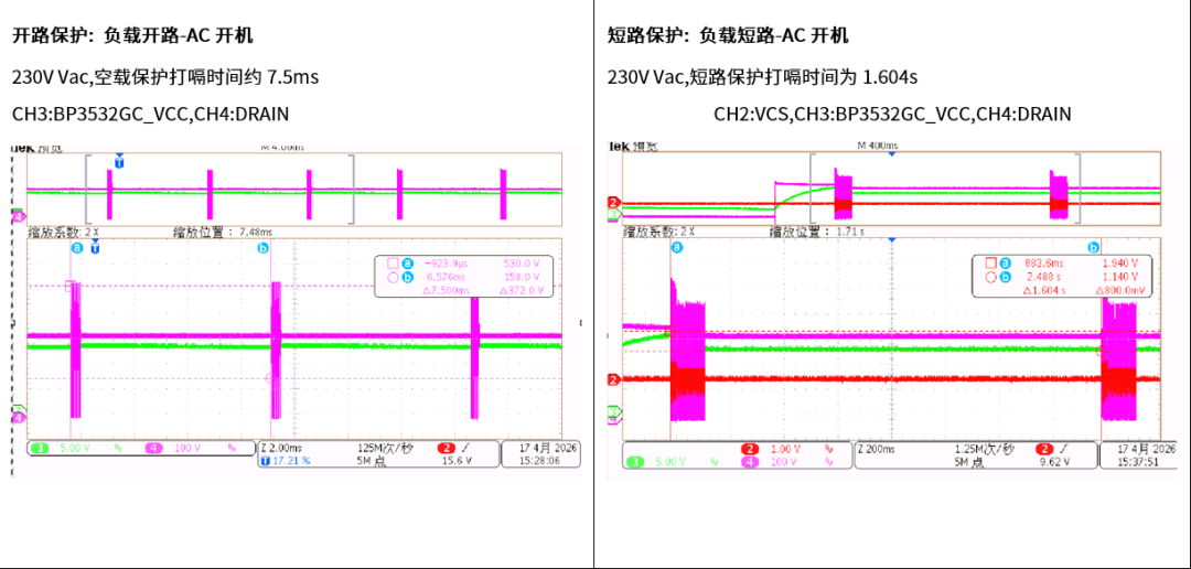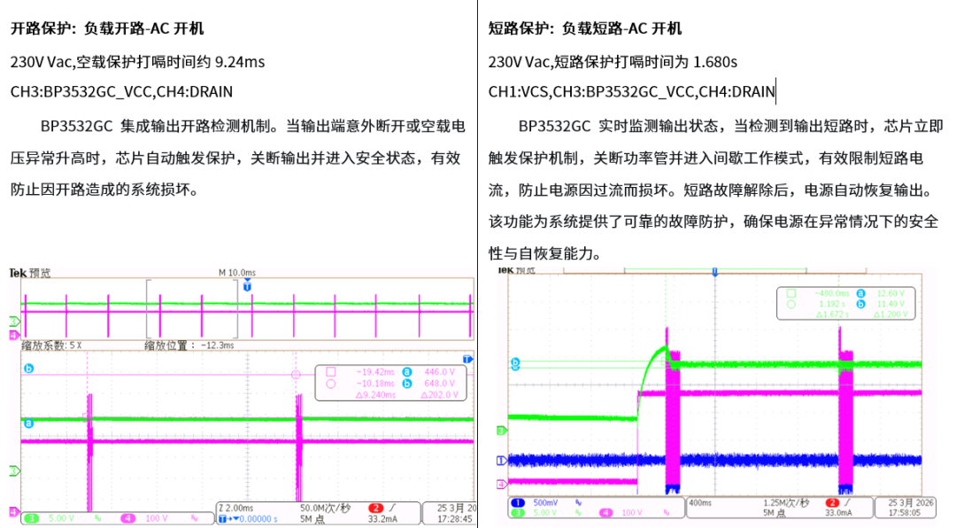 BP3532GC集成恒压+恒流双反馈功能。当输出功率从轻载逐渐增大满载时,输出电压保持稳定;当功率超过恒流设定点之后,芯片进入恒流反馈模式,输出电流维持最大恒流值,输出电压开始平滑下降,当VCC电压降至VCC_UVLO后停止输出。整个过程线性过渡、无跳变,实现了电源在过载情况下保持输出精准的恒流保护功能。