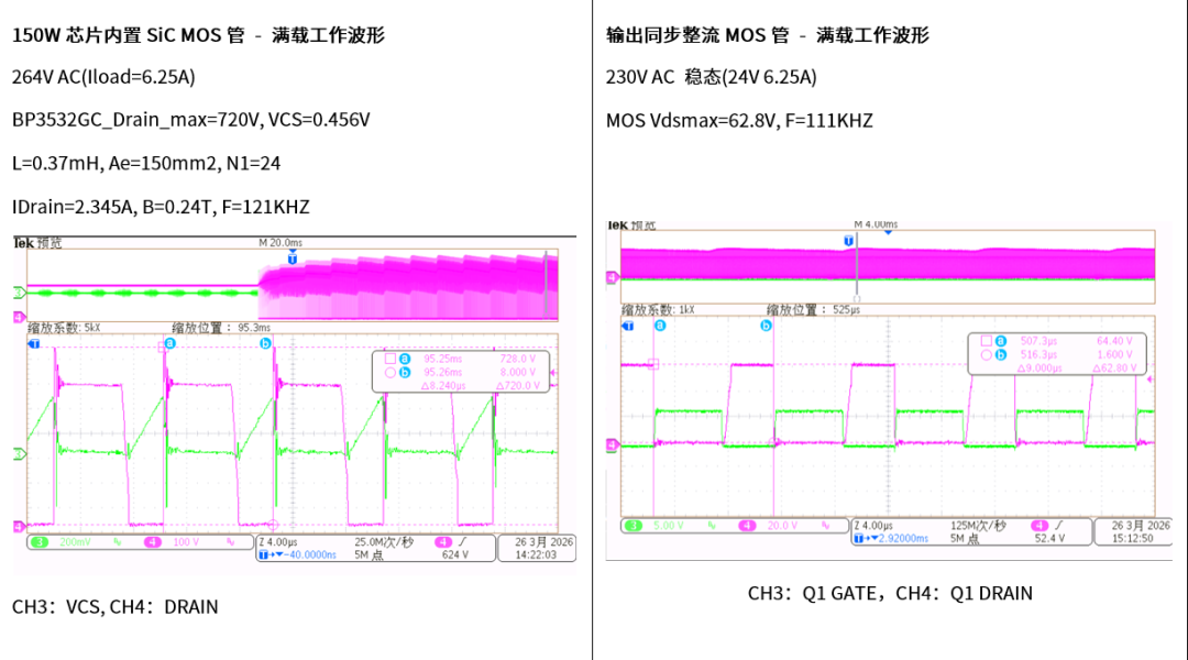 全功率范围内谷底导通模式工作,单级低PF应用,系统效率>93%。BP3532GC在 200W /150w反激恒压电源方案中实现了系统效率大于93% 的优异表现。这得益于芯片内置直驱800V SiC MOSFET,和全功率范围内,全程实现 MOSFET准谐振谷底导通控制,显著降低了开关损耗。