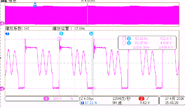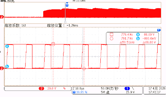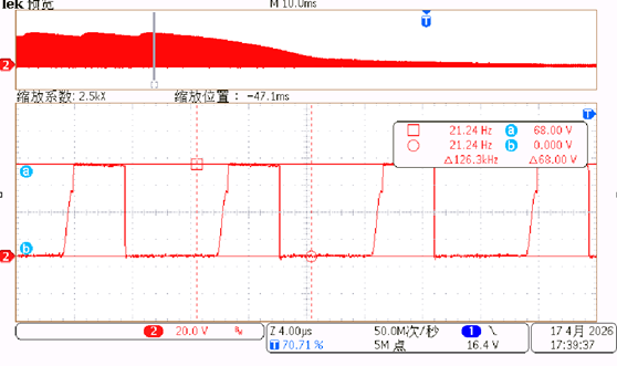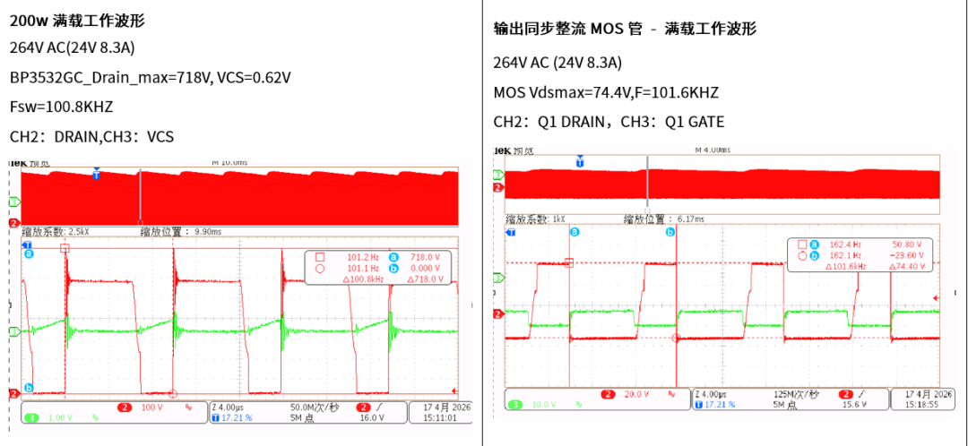 BP3532GC 在全功率范围内, MOSFET 都在最低谷底电压点开通,有效降低了开关损耗,从而显著提升系统效率。同时,这一控制方式使副边同步整流 MOS 管的电压尖峰大幅降低,对 MOS 管的耐压要求也随之下降,允许选用更低耐压、更低成本的同步整流管,在提升可靠性的同时优化了系统成本。下图图1为带轻载时BP3532GC的VDS波形,为谷底导通。图2为同步整流DRAIN脚开机波形,无尖峰;图3为同步整流DRAIN脚关机波形,无尖峰。