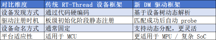 如今,RT-Thread 推出了新一代 DM(Device Manager)驱动框架,引入设备树(Device Tree)、自动匹配与动态 probe 机制,让驱动开发更加现代化、可扩展。