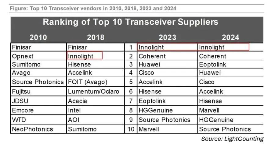 这场"蛇吞象"式的跨界并购,在十年后结出了硕果。2017年公司更名中际旭创,实行"山东资本+苏州研发+全球市场"模式。2018年率先量产400G光模块,此后从800G到1.6T始终保持技术领先,借AI浪潮崛起为全球光模块龙头。