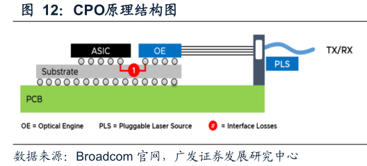 CPO概念的爆火,源于AI算力爆发倒逼下的硬件架构转型。传统可插拔光模块就像"分开办公"的两个部门,光引擎与交换芯片分别组装在主板不同位置,受制于功耗、传输速率与延迟,已逐步逼近物理极限。而CPO技术相当于把两个部门"搬到同一间办公室"——将光模块和交换芯片共封装在同一个基板上,大幅缩短信号传输距离,从根源上解决了损耗、延迟、功耗三大痛点,功耗可降低约50%。