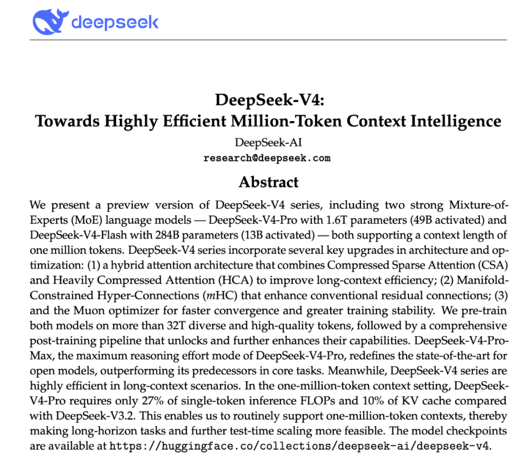 DeepSeek-V4以MIT许可证开源发布,模型权重已在Hugging Face、ModelScope平台开放,配套58页技术报告同步公开。