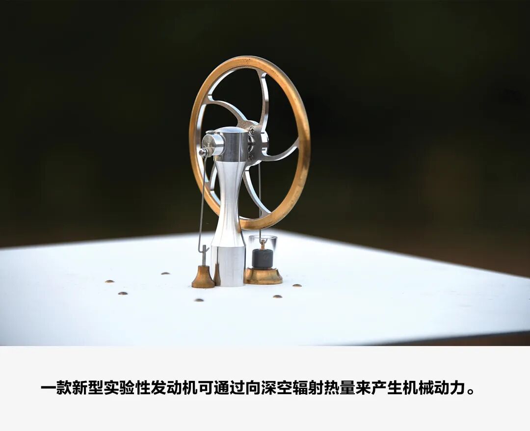 芒迪和同事将斯特林发动机连接至一块涂有辐射涂料的300毫米×300毫米金属板热辐射天线。天线可将斯特林发动机冷却至环境温度以下,降低其内部的气压,随后气体因环境热量而膨胀,形成持续的动力循环。