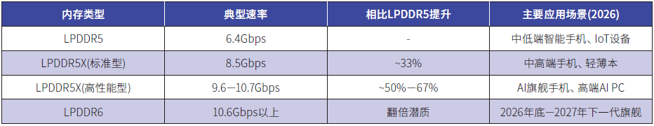 表1:LPDDR5系列与LPDDR6总结对比表(2026)。(来源:根据公开资料整理)