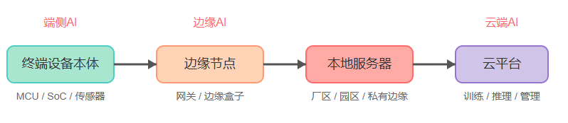 | 嵌入式AI | 把 AI 能力放进嵌入式设备里 | 设备载体、系统工程形态 | 单片机本地做动作识别 | | AI+嵌入式 | AI 行业能力与嵌入式行业结合 | 融合方向、应用边界更宽 | 用 DeepSeek 协助编写单片机程序 | | 边缘AI | 模型部署在靠近数据源的边缘节点 | 部署位置、系统架构 | 产线边缘盒子做视觉检测 | | 端侧AI | 模型直接部署在终端设备本体 | 部署位置更靠设备本体 | 智能摄像头本体做人形检测 | | 云端AI | 模型部署在服务器或云平台 | 集中式算力和远端服务 | 设备上传数据到云端做故障预测 |