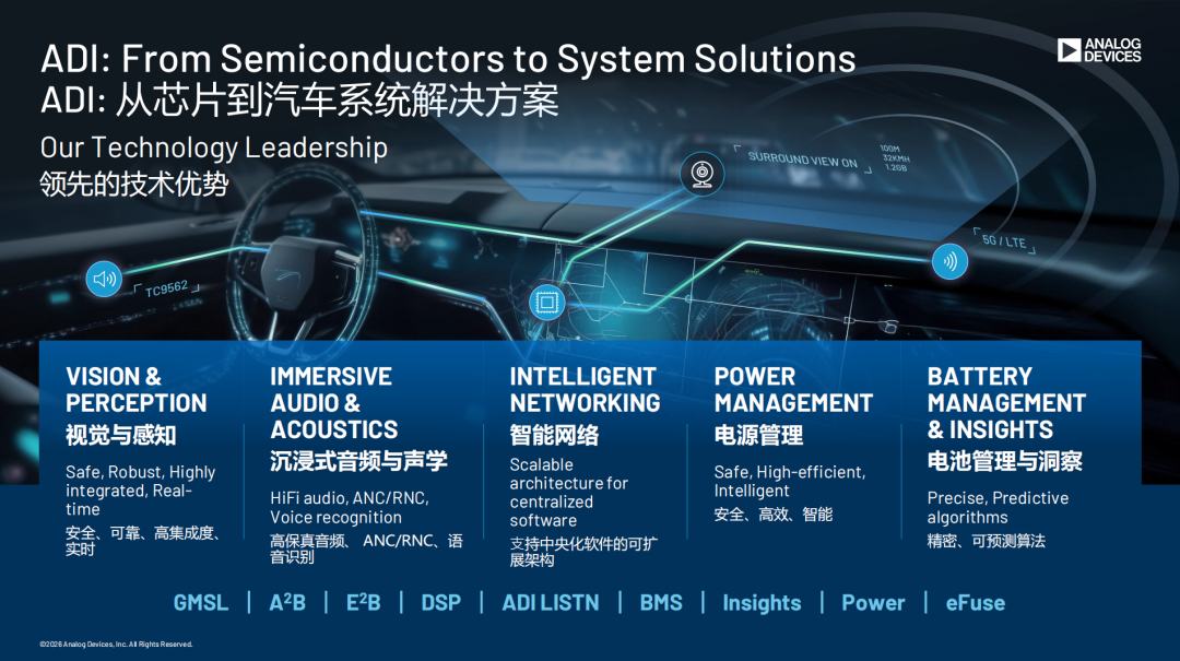 继首日在智能电动汽车发展高层论坛(2026)展出E²B创新方案外,今日ADI汽车业务全球副总裁Shalini Palmer在国际论坛发表主旨演讲,围绕全球汽车产业变革趋势分享了ADI从芯片到系统的技术 -