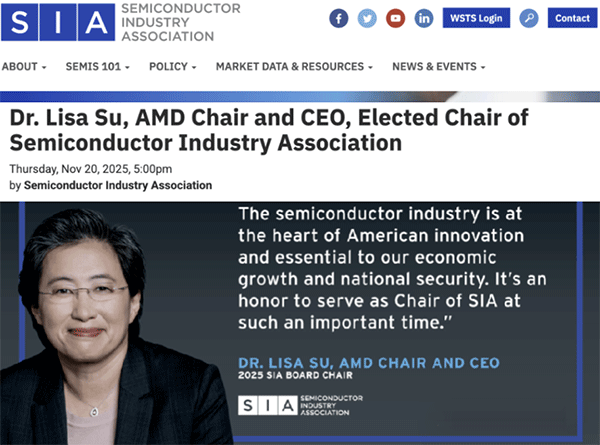当地时间11月20日,美国半导体行业协会(SIA)宣布重要人事任命:AMD董事长兼CEO苏姿丰博士当选SIA董事会主席。 据悉,SIA的成员企业不仅贡献了美国半导体行业99%的营收,更覆盖了全球近三分